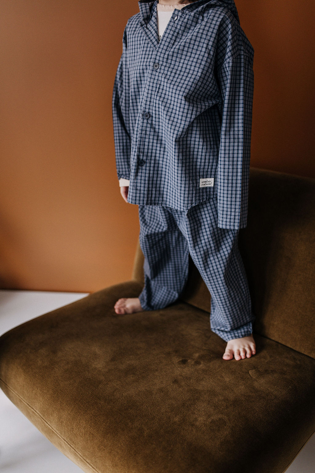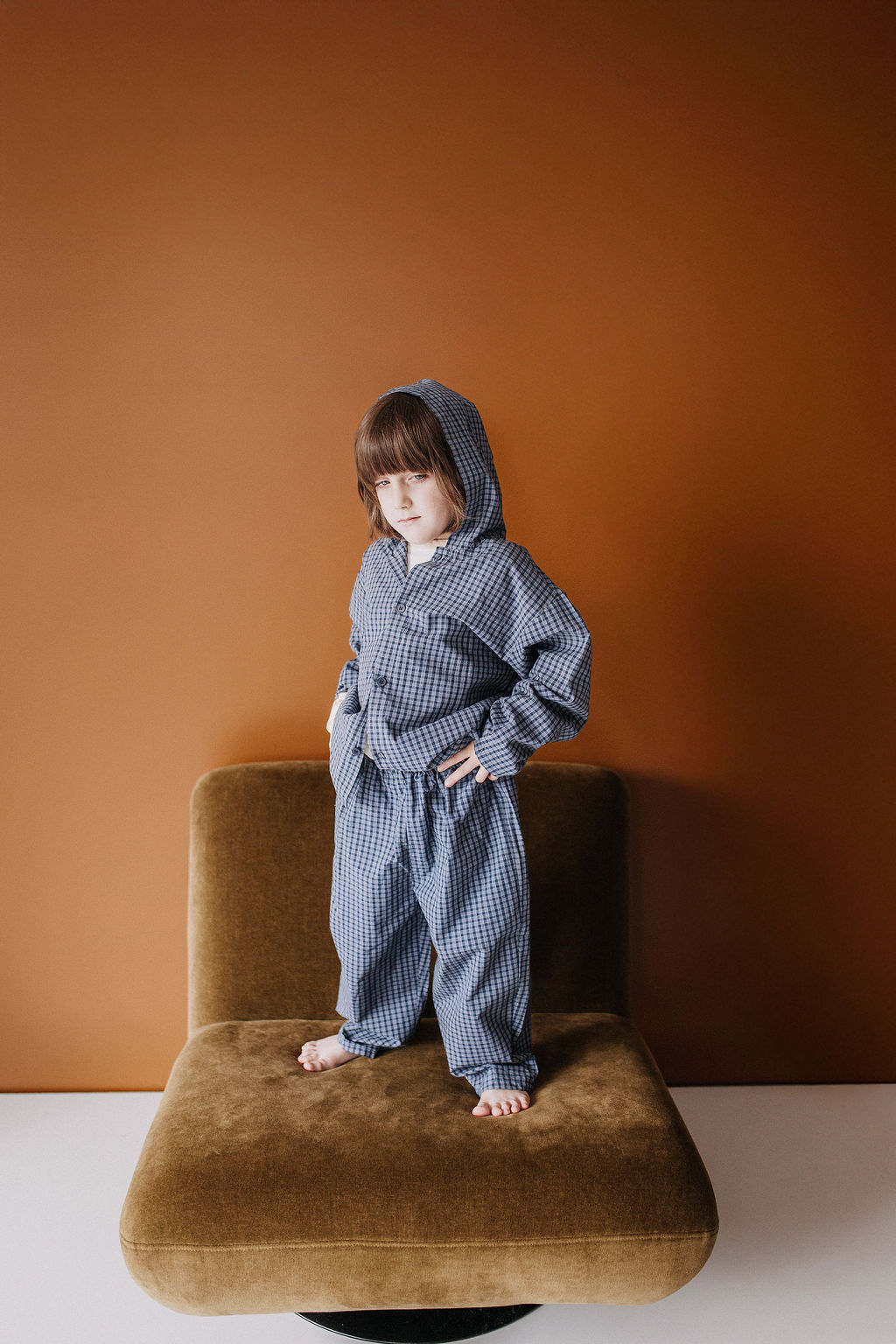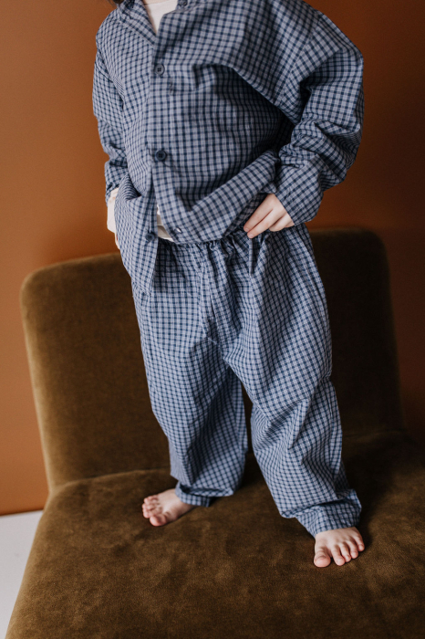 Realizat din bumbac, în stil minimalist, pantaloni și cămașă cu glugă.