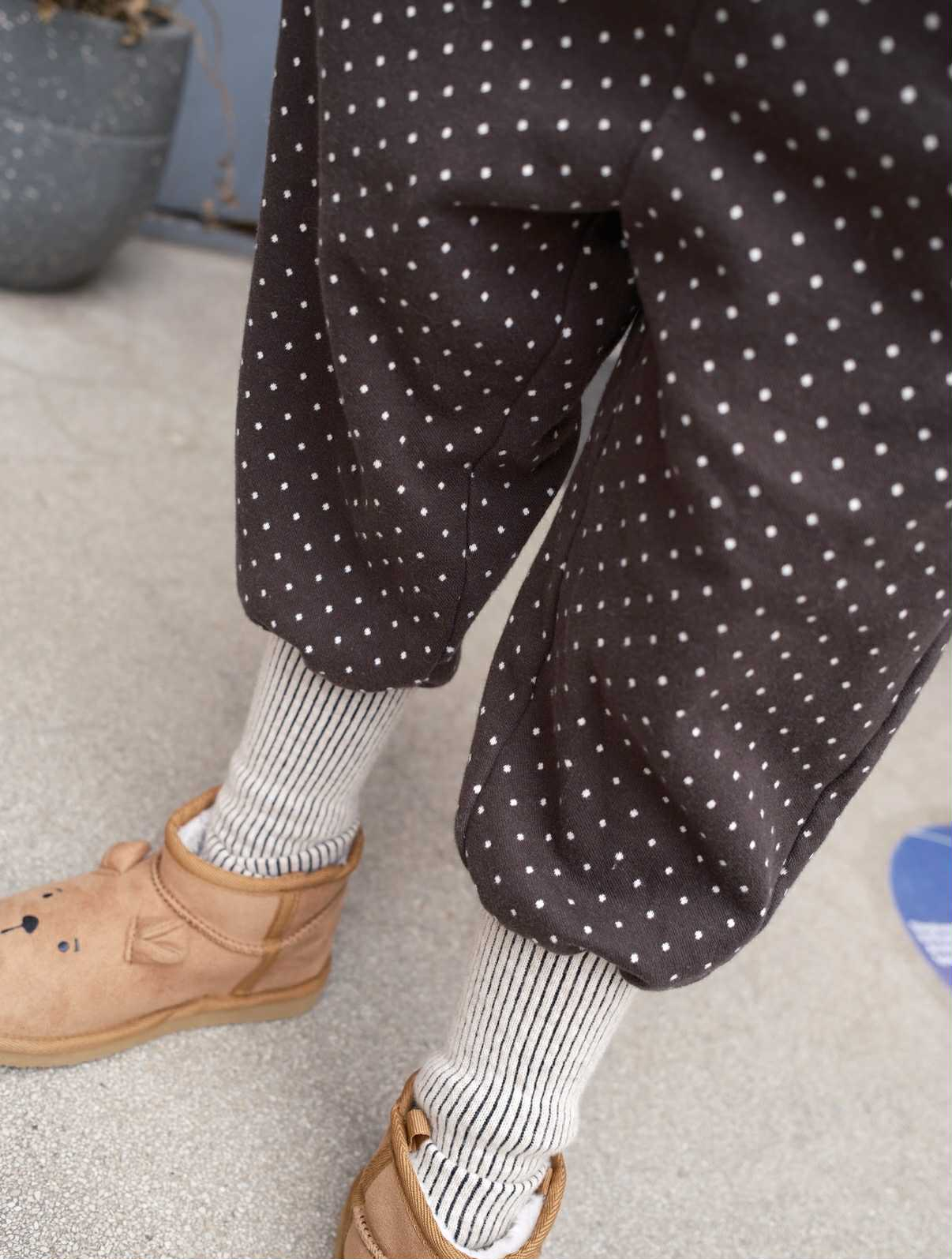 Pantaloni care se lasă liberi până sub genunchi și apoi se așază ca o a doua piele, cu gaura discretă la călcâi. Materialul moale și flexibil însoțește aventuri prin frunze, zăpadă sau joacă fără grabă, oferind confort și libertate.
